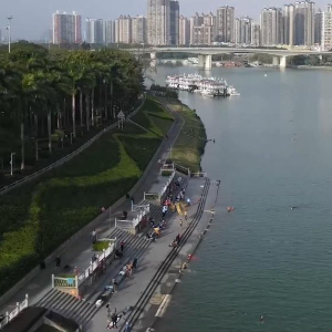 广西南宁的母亲河邕江河畔,两岸绿树成荫,白鹭翩迁,不少附近居民来到这里运动休闲,在亲水平台感受这条穿城而过的母亲河带来的惬意。