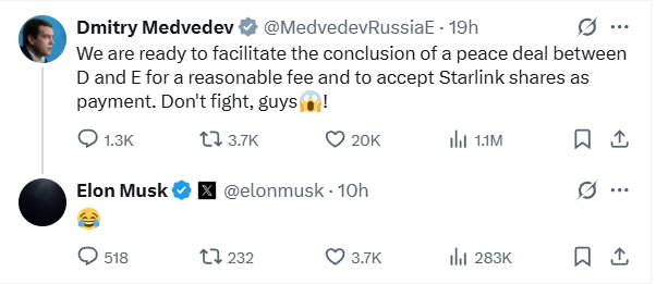 特朗普与马斯克爆发“口水战”后,俄罗斯联邦安全会议副主席梅德韦杰夫在马斯克旗下社交平台X发帖,表示俄方“愿意促成D(唐纳德·特朗普)和E(埃隆·马斯克)达成和平协议”,不过需要收取“合理的费用”,可以用马斯克的“星链”公司股票支付。