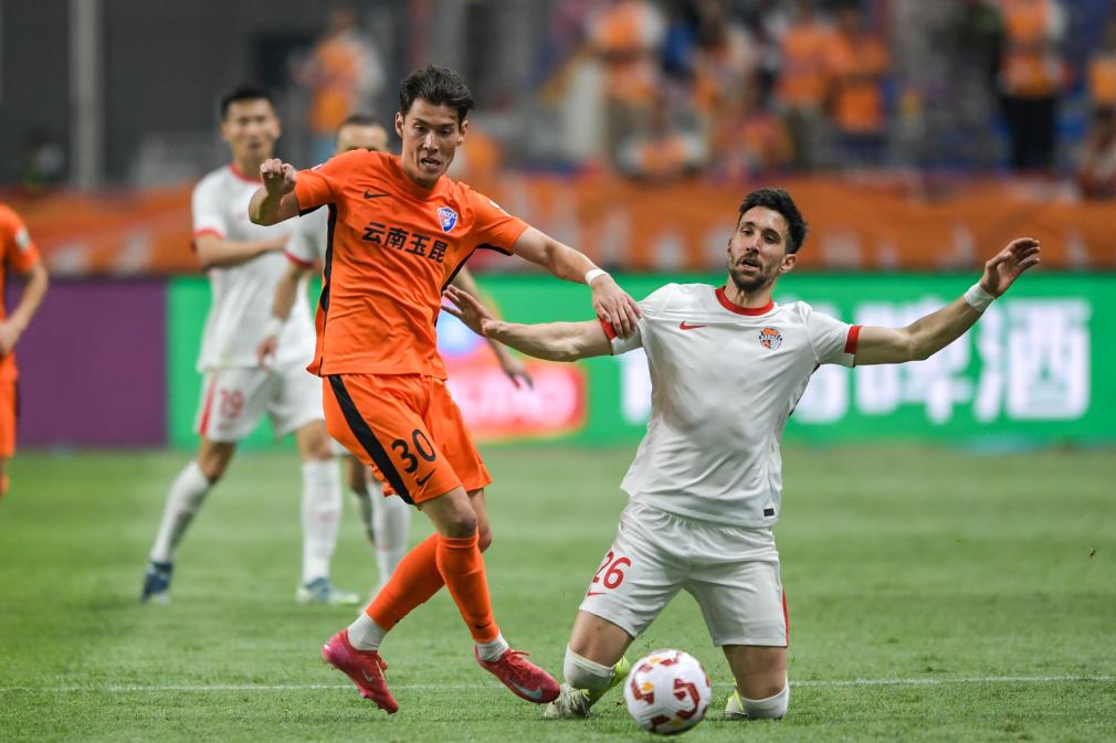 2025年4月6日,云南玉昆队球员侯永永(左)在2025赛季中国足球超级联赛第五轮比赛中。新华社记者 陈欣波 摄