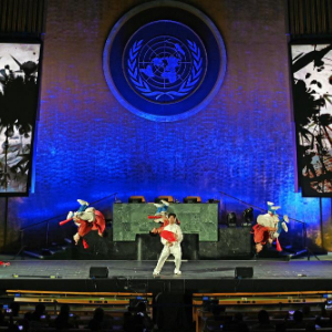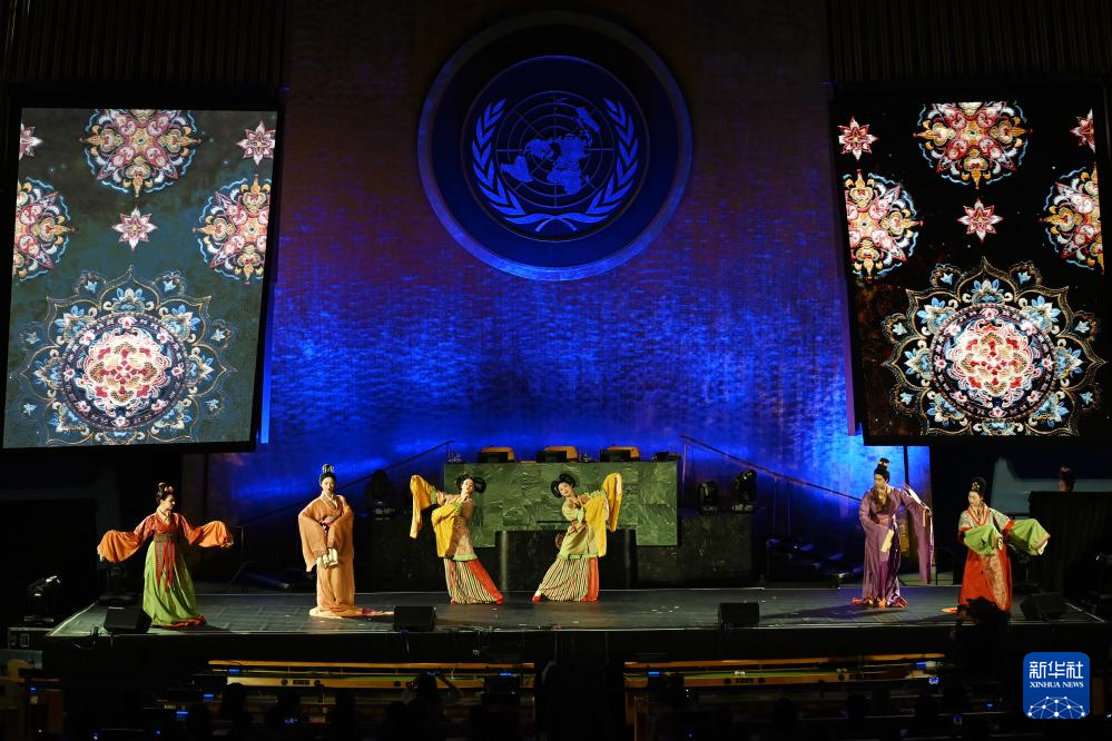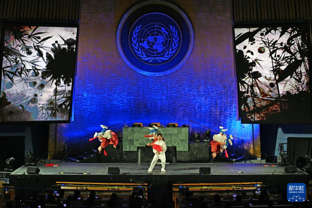 当晚,“跨越山海的文明对话”专场文艺演出在联合国大会厅举行。来自十几个国家的演员同台表演器乐、街舞、武术、舞蹈、合唱等节目,奉献了一场中外合璧的艺术盛宴。