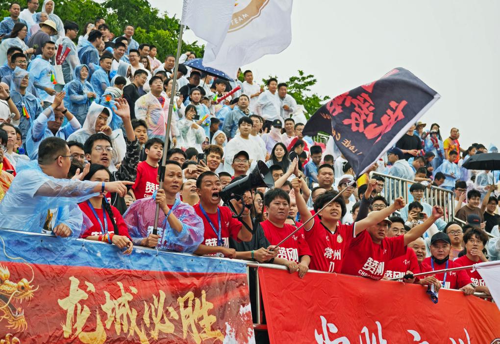 ↑6月1日,在2025年江苏省城市足球联赛第三轮南京队对阵无锡队的比赛中,南京队球迷在场边加油助威。