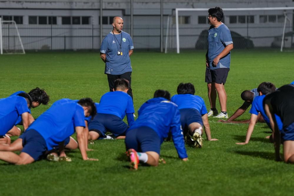 ↑6月9日,南京队主教练何塞(后排左一)在指导球员训练。