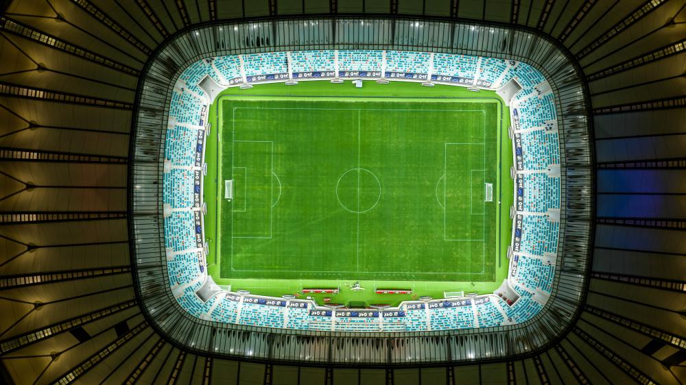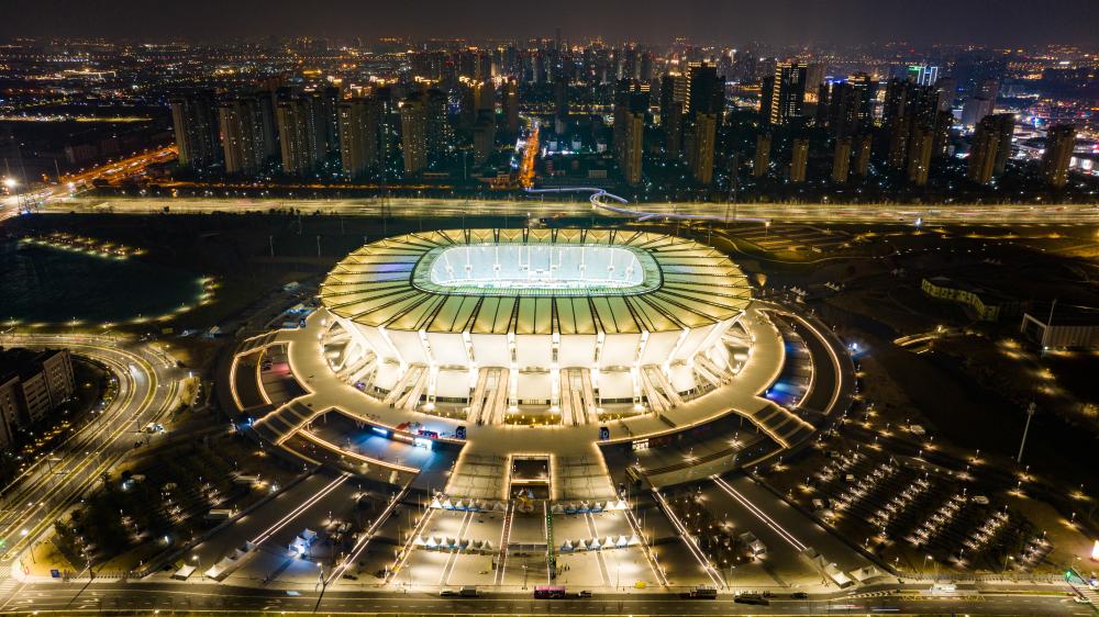 ↑这是2月5日拍摄的江苏省昆山奥体中心足球场夜景(无人机照片)。