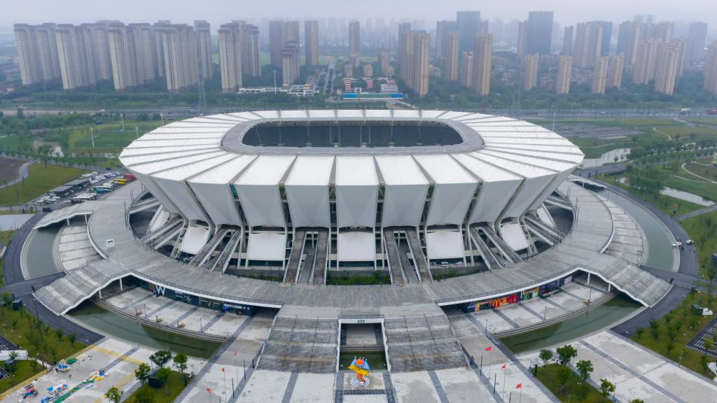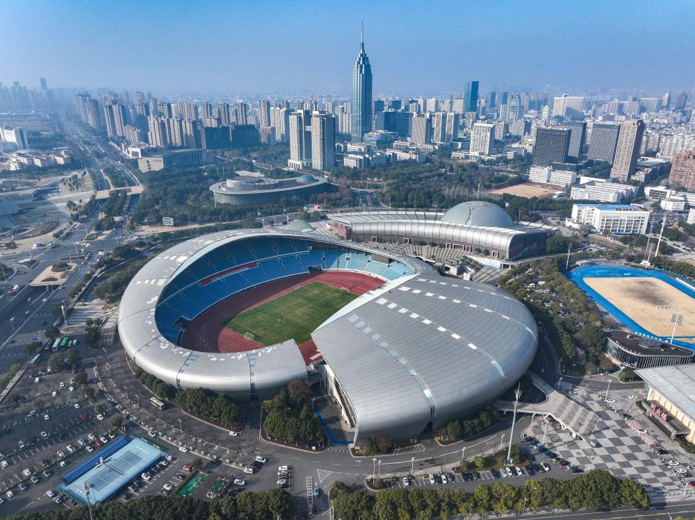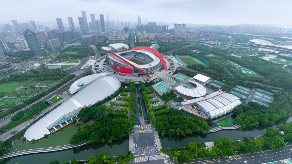 ↑这是6月9日拍摄的南京奥体中心全景(无人机照片)。
