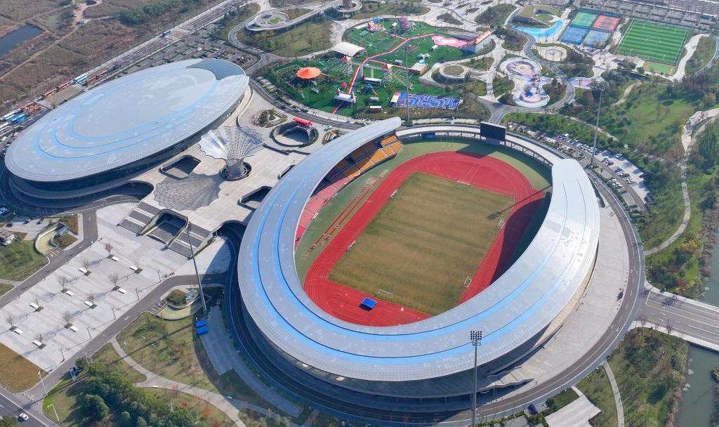 ↑这是6月9日拍摄的江苏省昆山奥体中心足球场(无人机照片)。