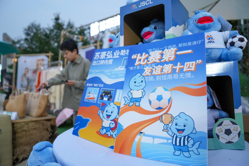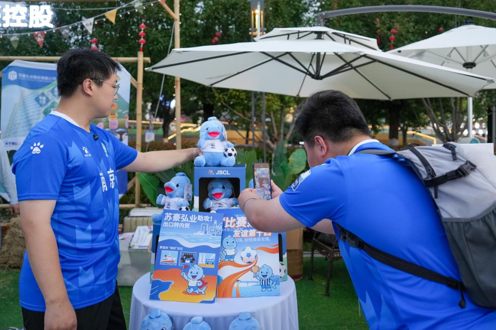 ↑6月3日,市民在2025年全国“服务消费季”暨“苏新服务·惠享生活”活动现场选购江苏省城市足球联赛主题纪念品。