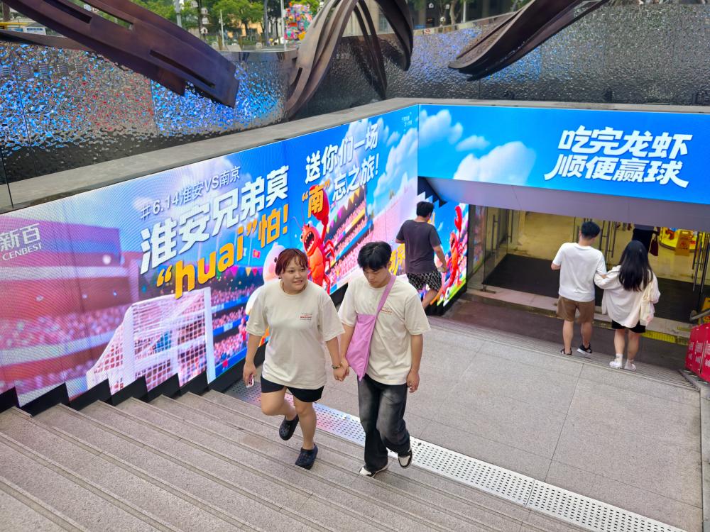 ↑6月10日,市民从南京一处商场的江苏城市足球联赛广告牌旁经过。