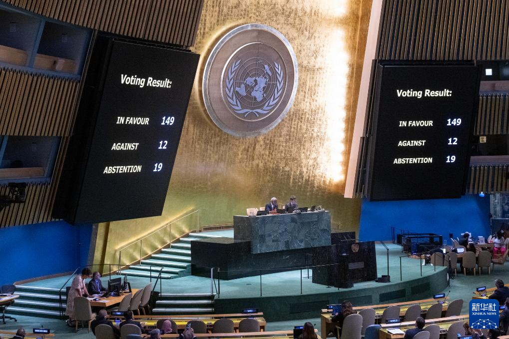 6月12日,在位于纽约的联合国总部,联合国大会紧急特别会议的表决结果显示在电子屏上。新华社发(联合国供图/埃瑟金德尔·德贝贝摄)