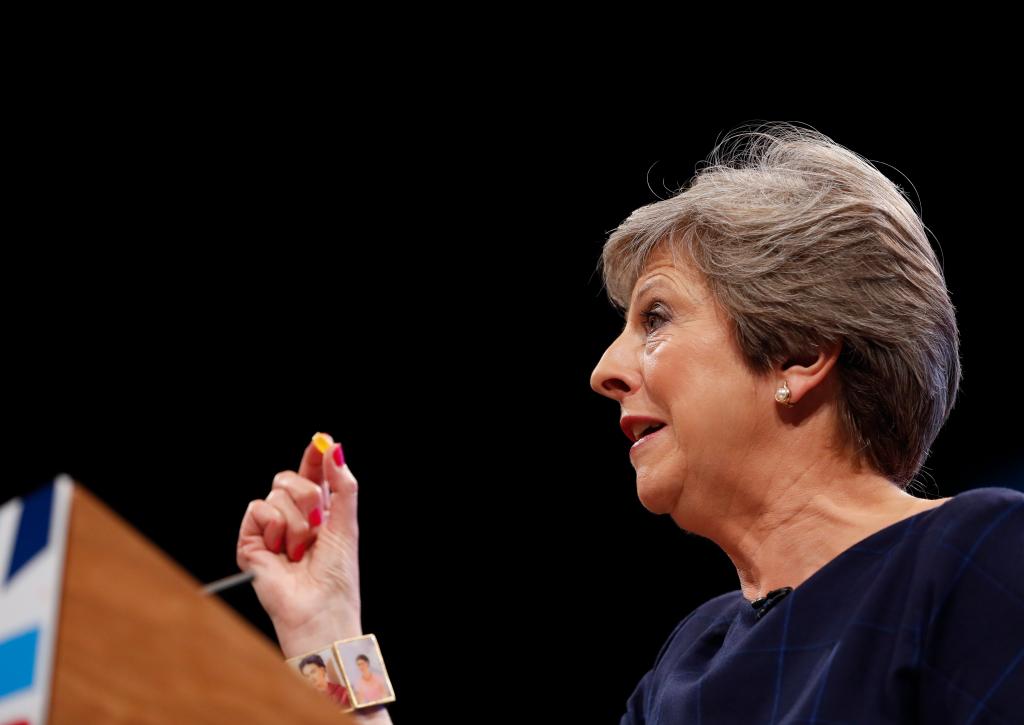 2017年10月4日,在英国曼彻斯特,特雷莎·梅在演讲时咳嗽不止,随后财政大臣哈蒙德递上一块润喉糖。