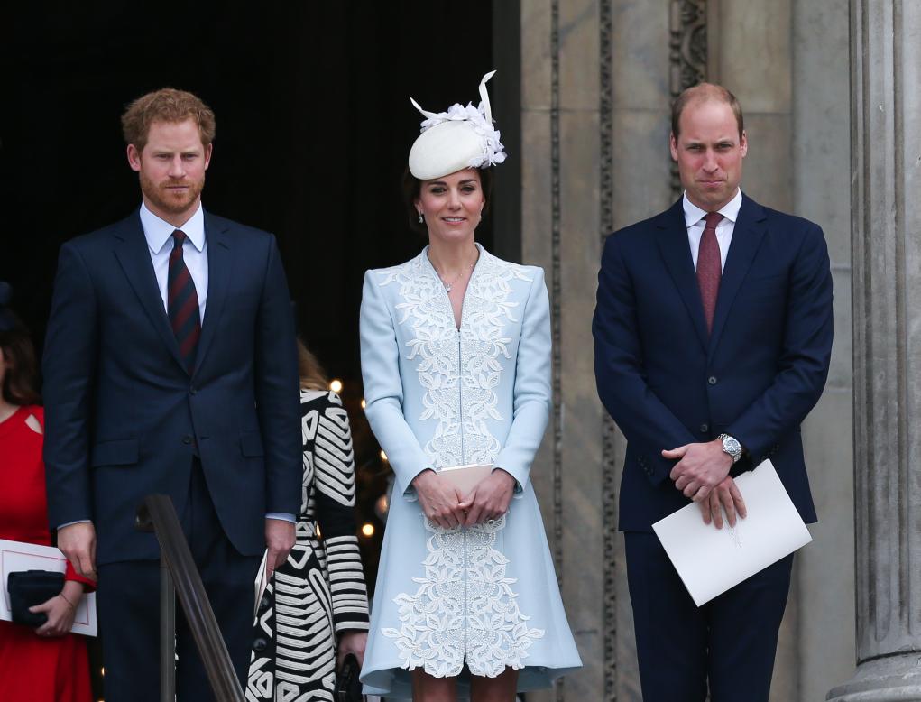 2016年6月10日,在英国伦敦,威廉王子(右)、凯特王妃(中)和哈里王子离开圣保罗大教堂。