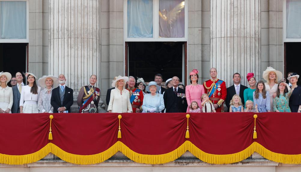2017年6月17日,英女王伊丽莎白二世(中)与王室成员在白金汉宫阳台上观看飞行表演。