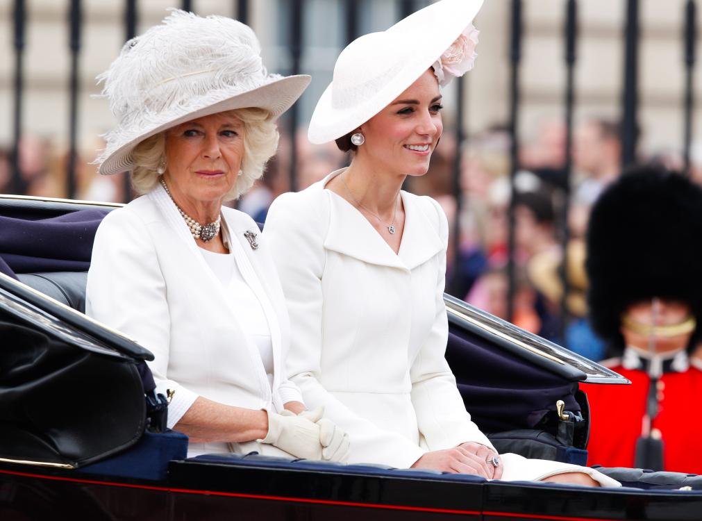 2016年6月11日,在英国伦敦,凯特王妃(右)与卡米拉乘坐马车离开白金汉宫。