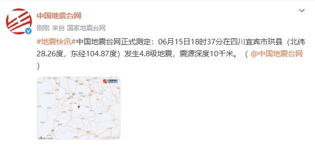中国地震台网正式测定:6月15日18时37分在四川宜宾市珙县(北纬28.26度,东经104.87度)发生4.8级地震,震源深度10千米。