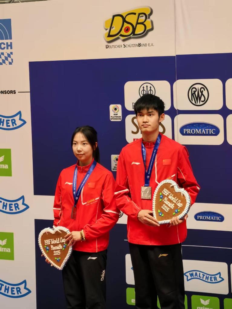 新华社北京6月14日电 国际射击运动联合会官网14日消息,在射击世界杯慕尼黑站(步手枪项目)收官日的两项混合团体比赛中,中国队姚千寻和胡凯拿下气手枪冠军,王子菲和盛李豪的组合打破气步枪的资格赛世界纪录并收获银牌。
