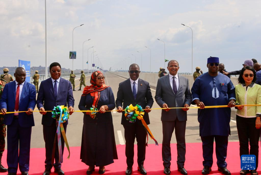 6月19日,在坦桑尼亚姆万扎省,坦桑尼亚总统哈桑(左三)在马古富力大桥通车仪式上剪彩。新华社发(中国土木工程集团有限公司供图)