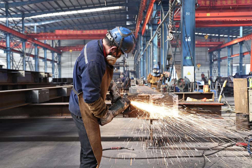 在位于瑞金市的江西昊宇重工有限公司生产车间内,工人正在进行切割作业。(杨鑫 摄)