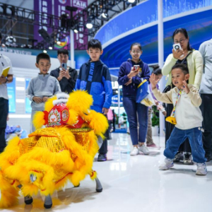 6月22日,家长带着小朋友在第9届南博会上与机器狗互动。新华社记者 陈欣波 摄
