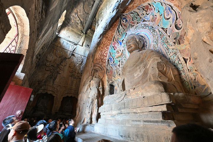 10月2日,游客在位于河北省邯郸市峰峰矿区的响堂山石窟景区参观游览。新华社记者 李鑫 摄