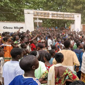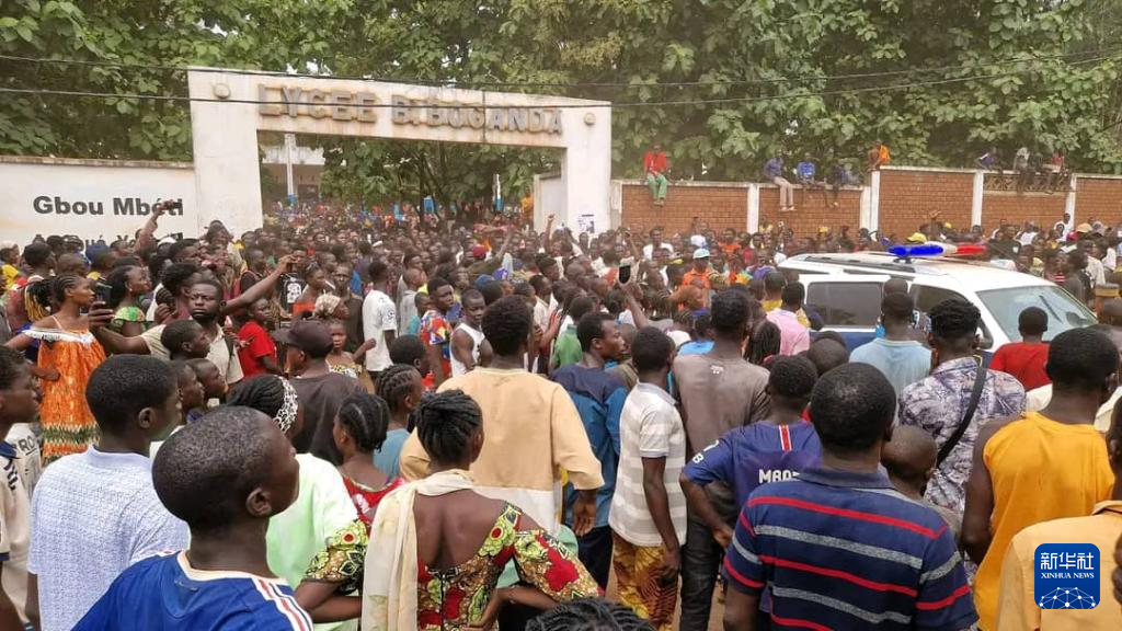 6月25日,人们聚集在中非共和国首都班吉的巴泰勒米·博甘达高中门前。新华社发