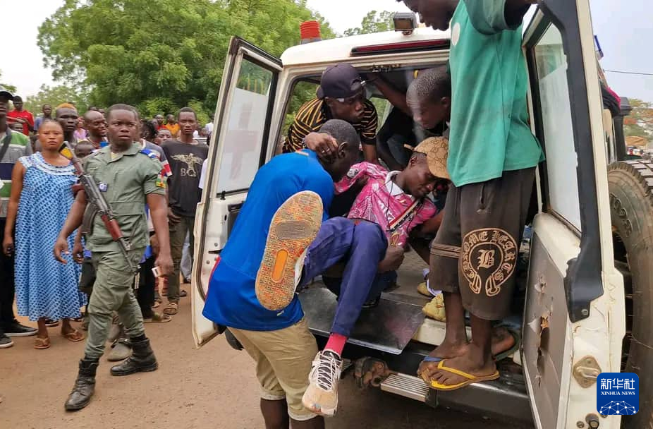 6月25日,在中非共和国班吉,踩踏事件伤员被送上救护车。新华社发