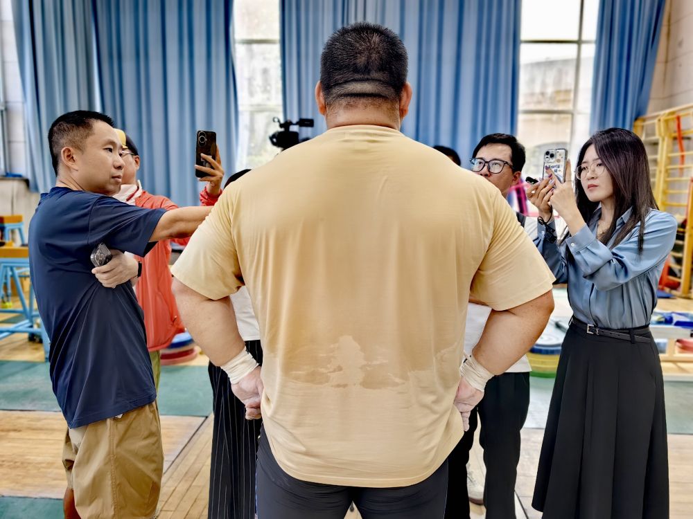 举重老将艾雨南被汗水浸透衣衫。本文图片均为杜文杰摄