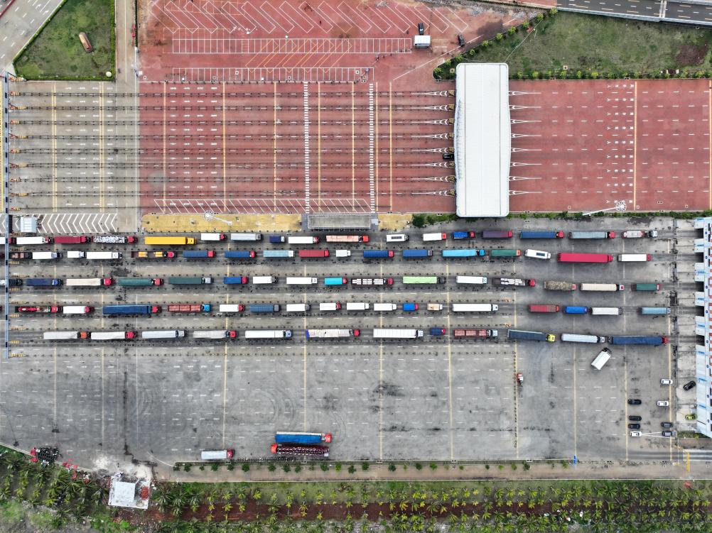 在徐闻港排队等待过海的车辆(5月12日摄,无人机照片)。新华社发