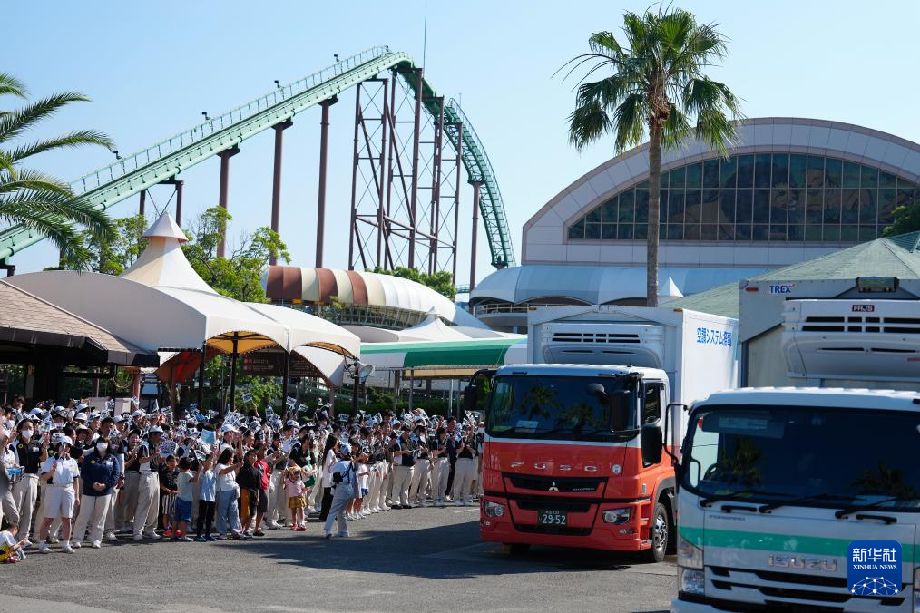 6月28日,工作人员与当地民众在日本和歌山县冒险世界游乐园外目送运输大熊猫的卡车离开。新华社记者 贾浩成 摄