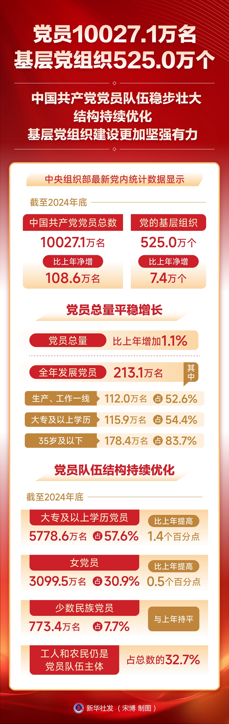 党员队伍结构持续优化。截至2024年底,大专及以上学历党员5778.6万名,占57.6%,比上年提高1.4个百分点;女党员3099.5万名,占30.9%,比上年提高0.5个百分点;少数民族党员773.4万名,占7.7%,与上年持平;工人和农民仍是党员队伍主体,占总数的32.7%。