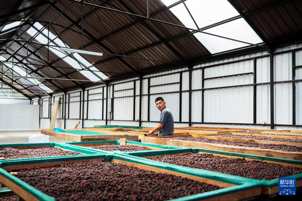 2月3日,在巴拿马奇里基省博克特地区,工人翻动咖啡豆。新华社记者 许咏政 摄