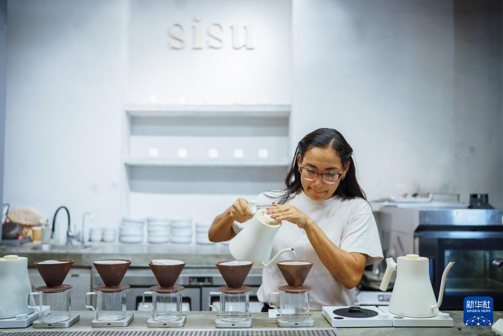 3月20日,在巴拿马首都巴拿马城,一家咖啡馆的员工冲泡瑰夏咖啡。新华社记者 许咏政 摄