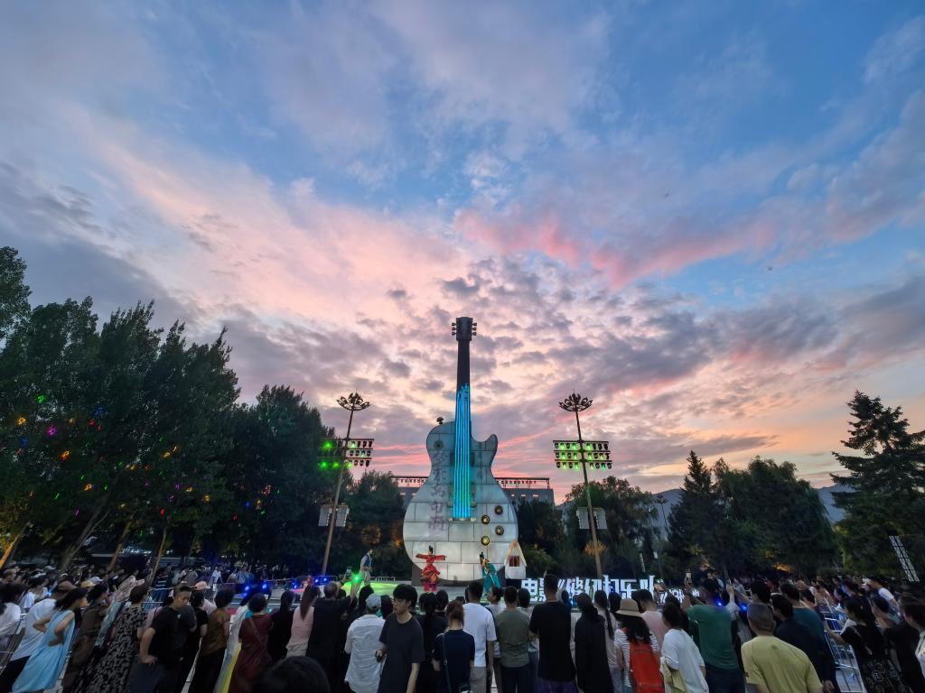 6月25日,人们在鸭绿江畔的大吉他音乐主题广场观看“梦萦高句丽”演出。新华社记者 孙鹏程 摄