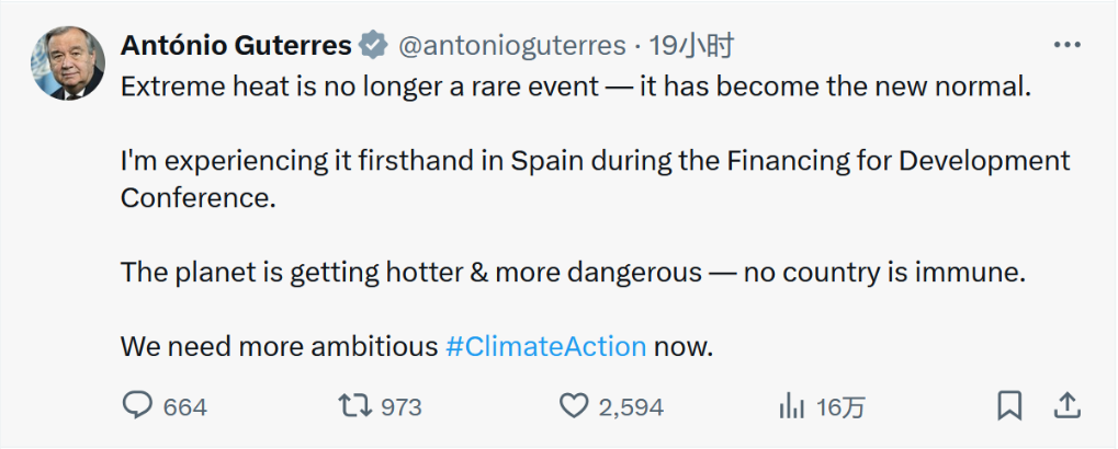 联合国秘书长古特雷斯6月30日在西班牙南部城市塞维利亚出席联合国第四次发展筹资问题国际会议。亲身经历西班牙热浪的他当天在社交媒体上发文感慨:“极端高温不再是罕见事件,它已成为新常态。”。