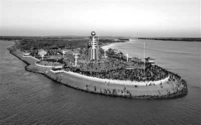 在黑龙江省抚远市的东极广场,游客观看日出(无人机照片)。记者 李拥军 摄
