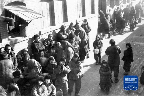 排队等待施粥的沈阳贫民。日本占领时期的东北人民挣扎在饥饿线上。