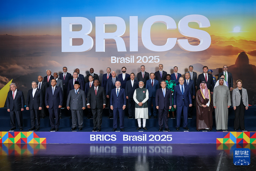 当地时间7月6日和7日,国务院总理李强在里约热内卢出席金砖国家领导人第十七次会晤第二及第三阶段会议,围绕加强多边主义、人工智能、环境和气候变化、全球卫生等议题发表讲话。这是7月7日,金砖成员国和伙伴国、嘉宾国领导人以及国际组织代表集体合影。新华社记者 刘彬 摄