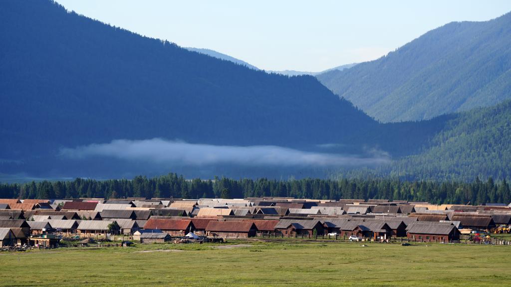 这是晨雾中的喀纳斯村。新华社记者 张啸诚 摄