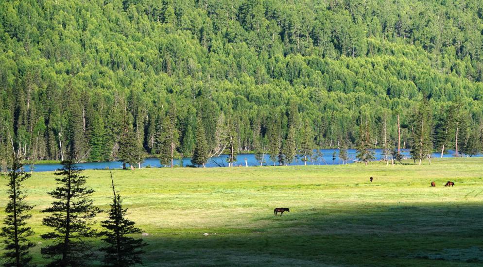 喀纳斯景区鸭泽湖附近,马儿在吃草。新华社记者 张啸诚 摄
