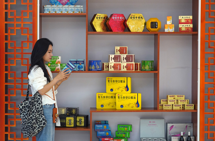 7月8日,游客在位于樟树市的仁和集团展厅参观中医药产品。新华社记者 万象 摄