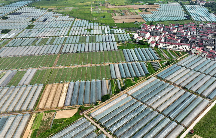 这是位于江西省高安市上湖乡的高安富硒辣椒产业园蔬菜大棚(7月7日摄)(无人机照片)。 新华社记者 万象 摄