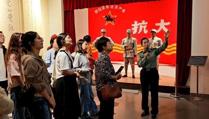 青年编辑记者在抗大陈列馆听取讲解。唐健辉摄