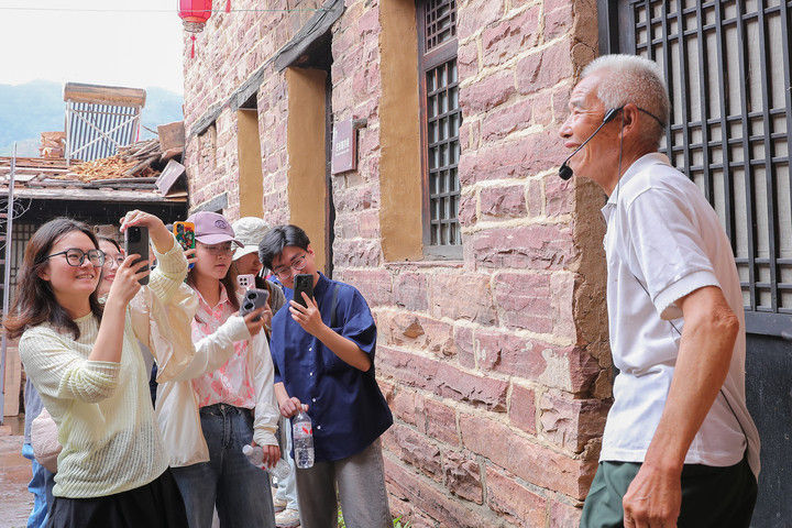 英谈村老支书路召洋为青年编辑记者讲解村史。(中国记协供图)
