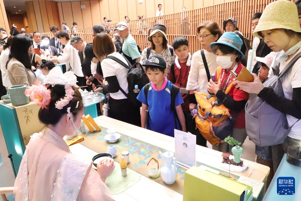 7月12日,人们在日本大阪世博会中国馆“浙江周”活动上观看宋代点茶展示。新华社记者 李子越 摄