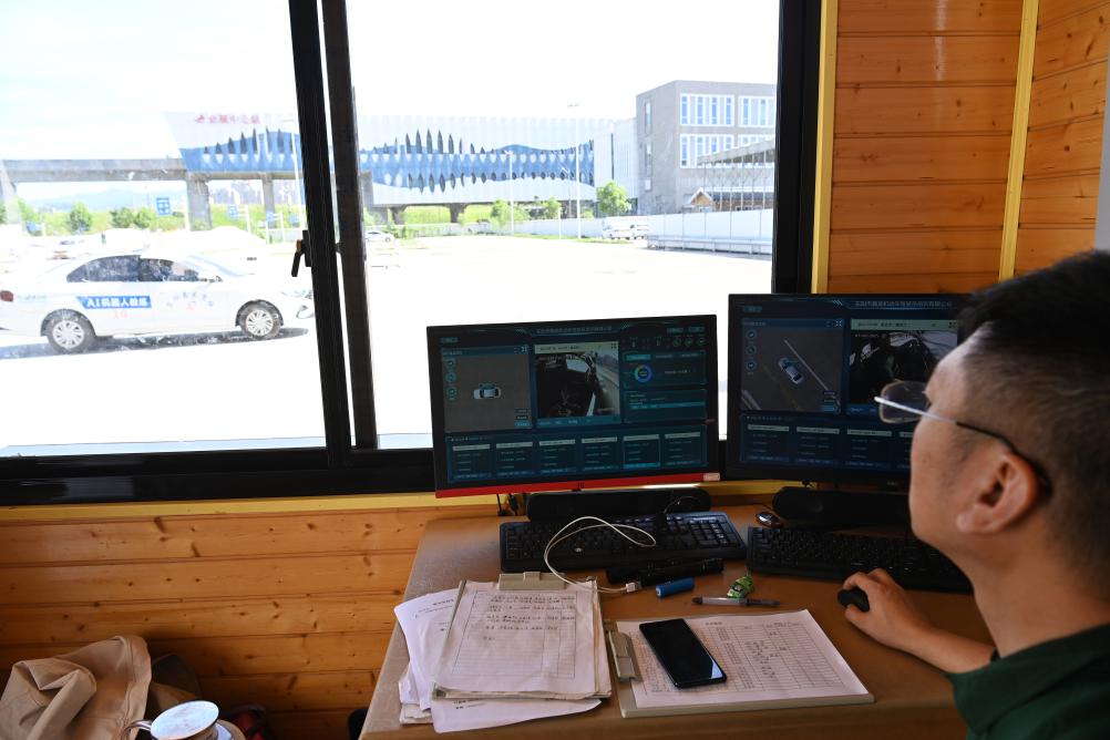 7月2日,驾校教练通过实时监控关注AI智能教练车行驶情况,并可随时与学员语音交流。