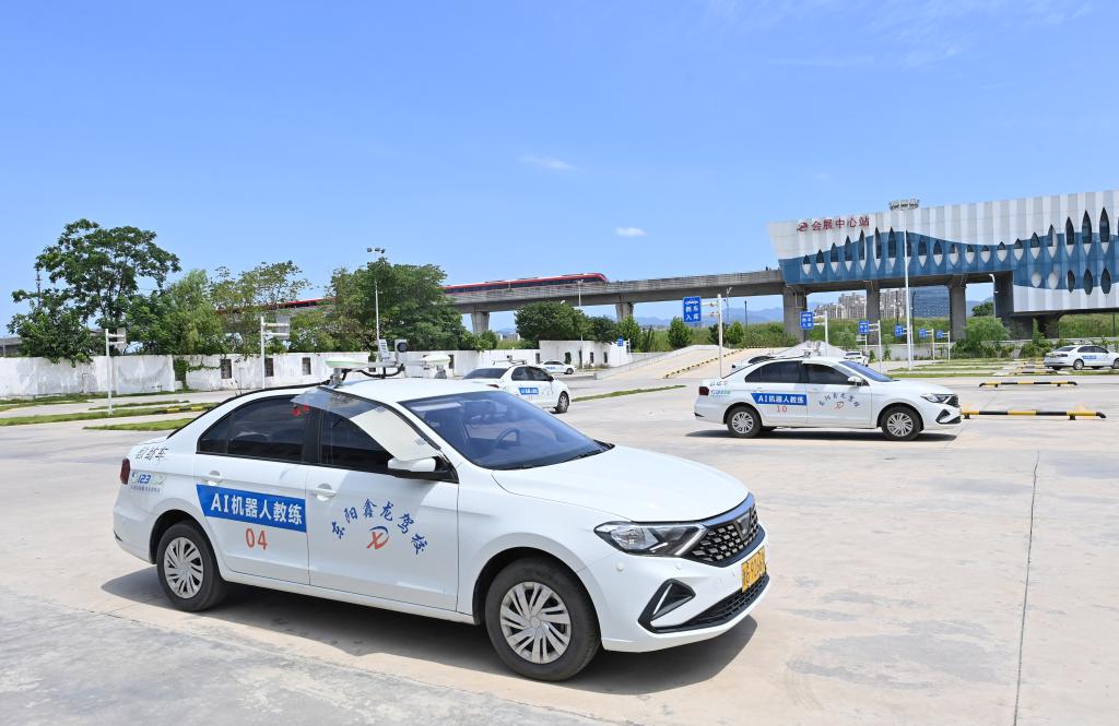 7月5日,在浙江省东阳市鑫龙驾校内,学员们驾驶装有AI教学系统的AI智能教练车。