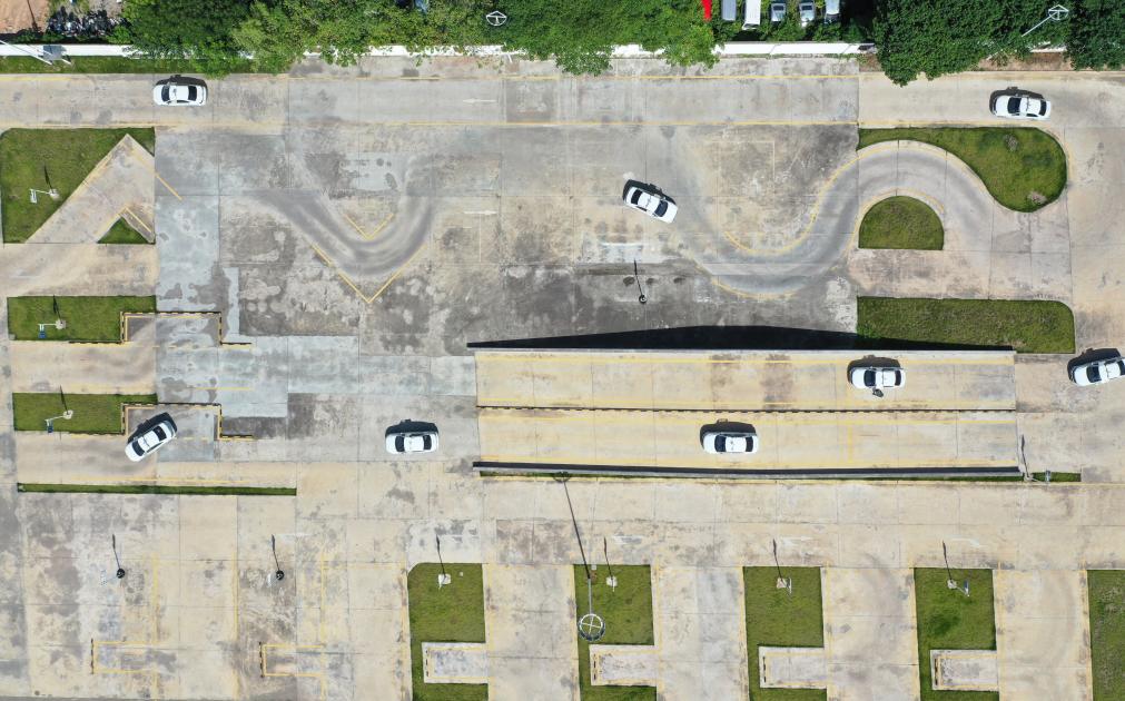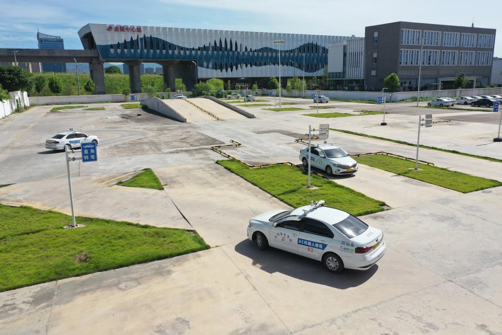 7月2日,学员们独立驾驶装有AI教学系统的AI智能教练车进行科目二的转弯、倒库等练习(无人机照片)。