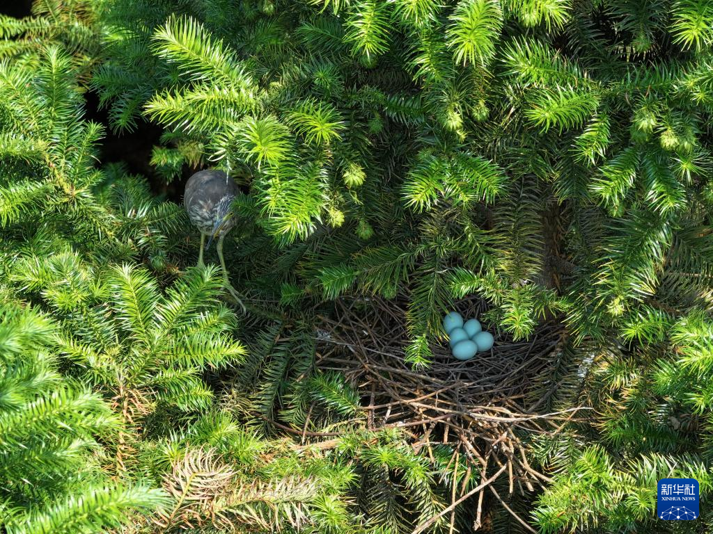 “鸟巢是用枯枝搭成的,中间略微凹进去,周边呈散开状,面积比普通的鸟窝要大,里面有5枚浅蓝色的蛋,一只池鹭站在鸟巢旁边。”唐盛利回忆起当时的情形。