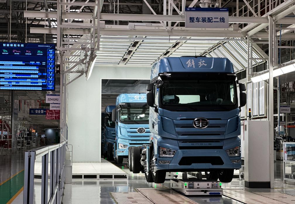 位于长春市的中国一汽红旗繁荣厂区,智能机器人挥舞着机械臂,在关键工位有序装配;AGV无人搬运小车,沿设定路线高效配送零部件。在一汽解放J7整车智能工厂,一辆辆最新型的J7高端重卡驶下生产线。