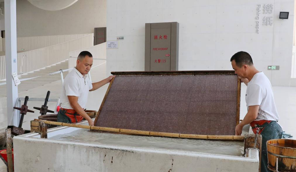 7月15日,在位于泾县的宣纸文化园,工人进行捞纸作业和展示。新华社记者龚兵 摄