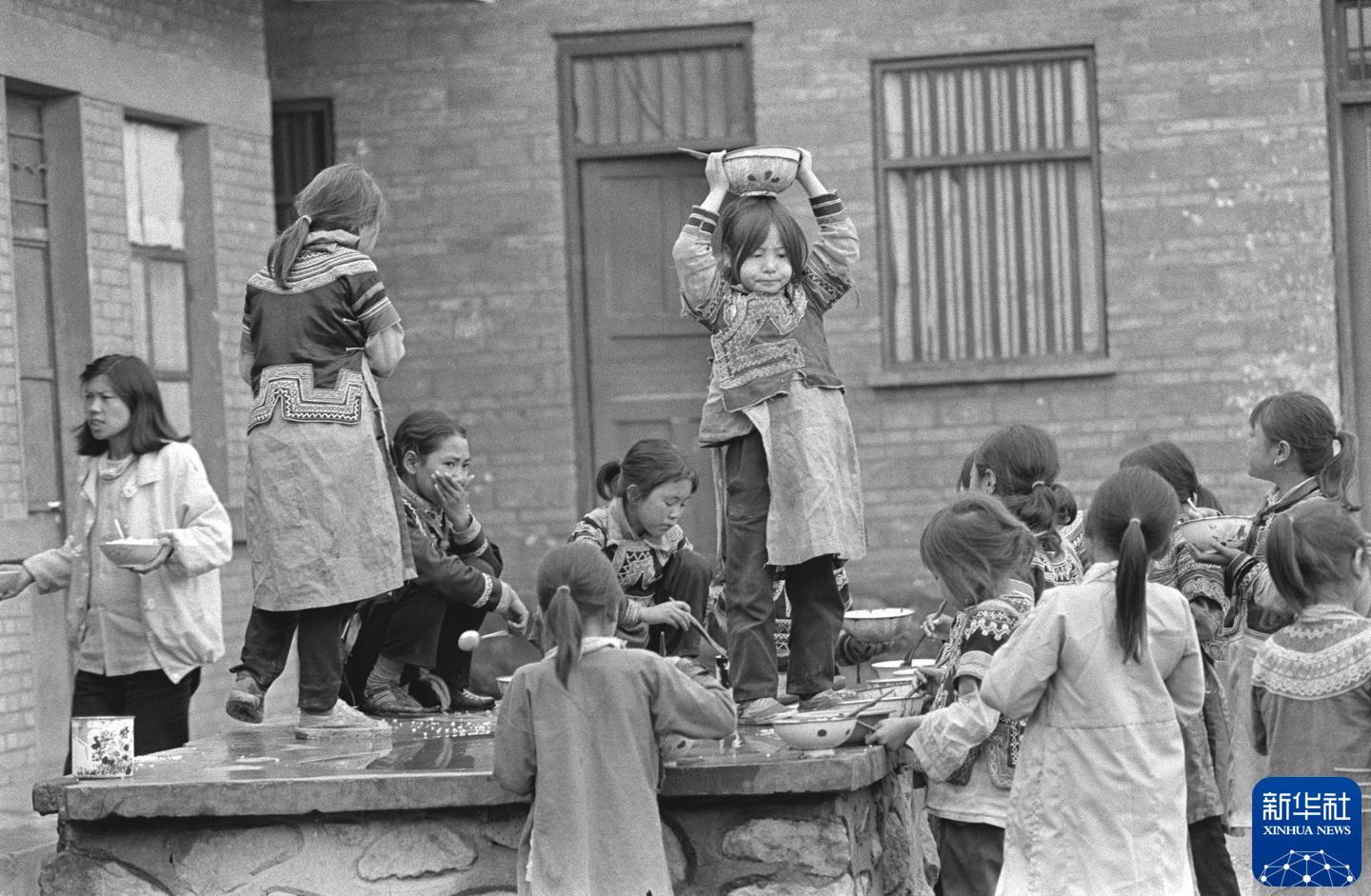没有饭堂,孩子们在教室外吃饭。(1992年10月1日发)