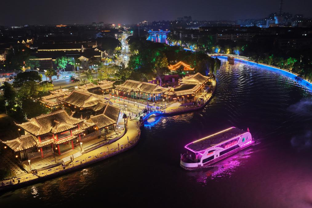 7月17日,游船行驶在扬州古运河上(无人机照片)。新华社发(孟德龙摄)
